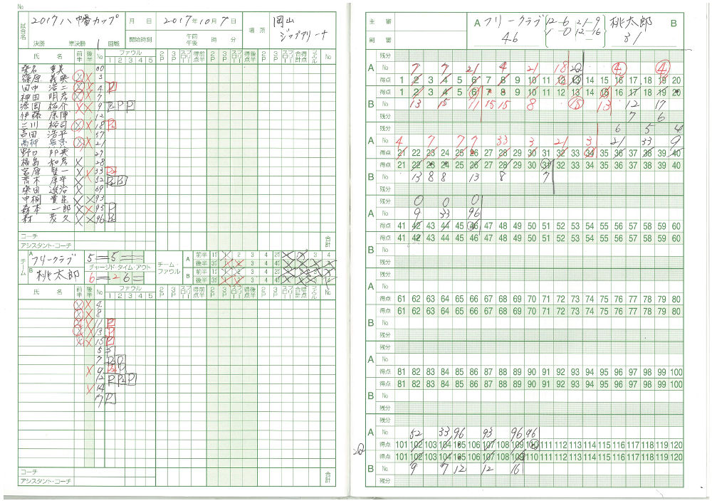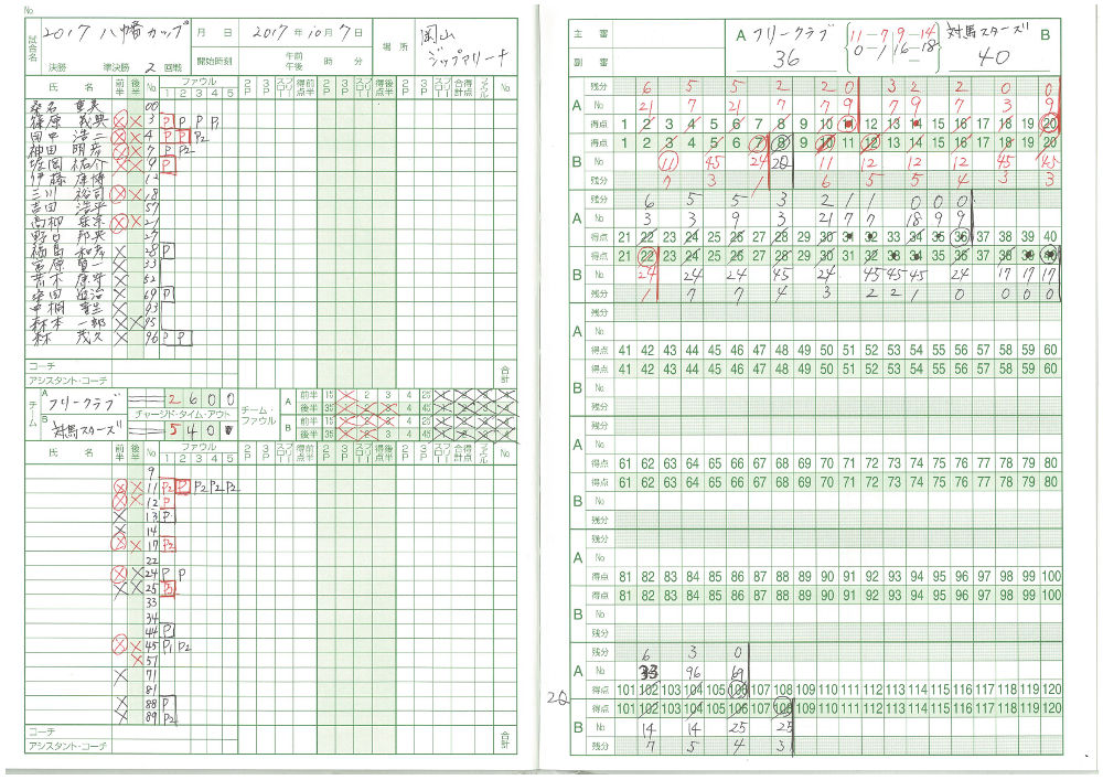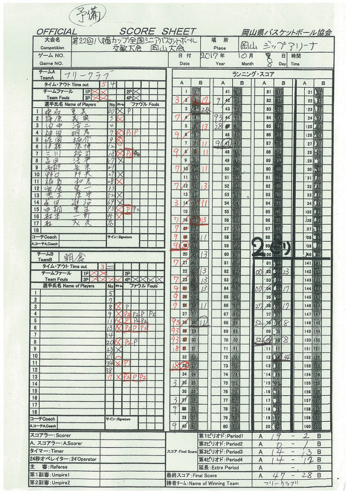 3Qで逆転を許し、最大7点差つけられました。 4Qで、同点まで盛り返しましたが、最後は逃げ切られました。 詳細スコア (動画: 1Q, 2Q, 3Q-1, 3Q-2, 3Q-3, 4Q-1, 4Q-2, 4Q-3, 4Q-4, 4Q-5, 4Q-6 ) | スーパーシニア交流戦#1 (10月7日(土)ジップアリーナ) |