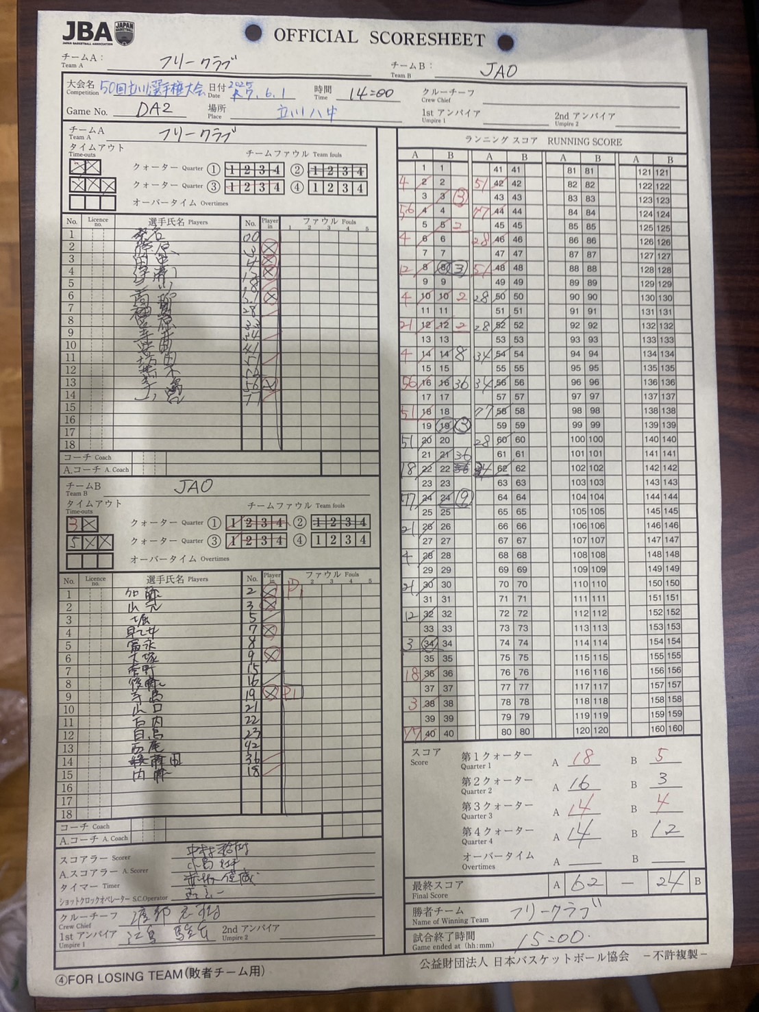 一回り上の大先輩相手に、忖度しながらの勝利でした。 詳細スコア, 動画 (参加者:吉田、高柳、伊藤、寺井、福島、坊田、一ノ宮、三川、篠原、手島、なべ、塩見) | 決勝 (6月29日(日)立川第八中) |